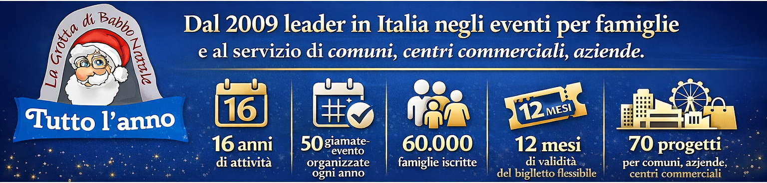 Ecco un'anticipazione degli eventi 2026 organizzati da Grotta di Babbo Natale: con la formula "biglietto aperto" Grotta di Babbo Natale risponde ad una delle necessità più avvertite dalle famiglie: non perdere i biglietti in caso di imprevisti.