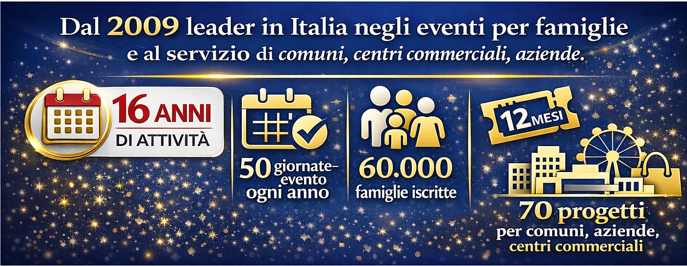 Siamo leader in Italia nell'organizzazione di eventi per il target famiglie: contattaci per l'organizzazione di eventi, spettacoli, animazioni, noleggio di attrezzature a tema, attività per gruppi. Per info clicca qui