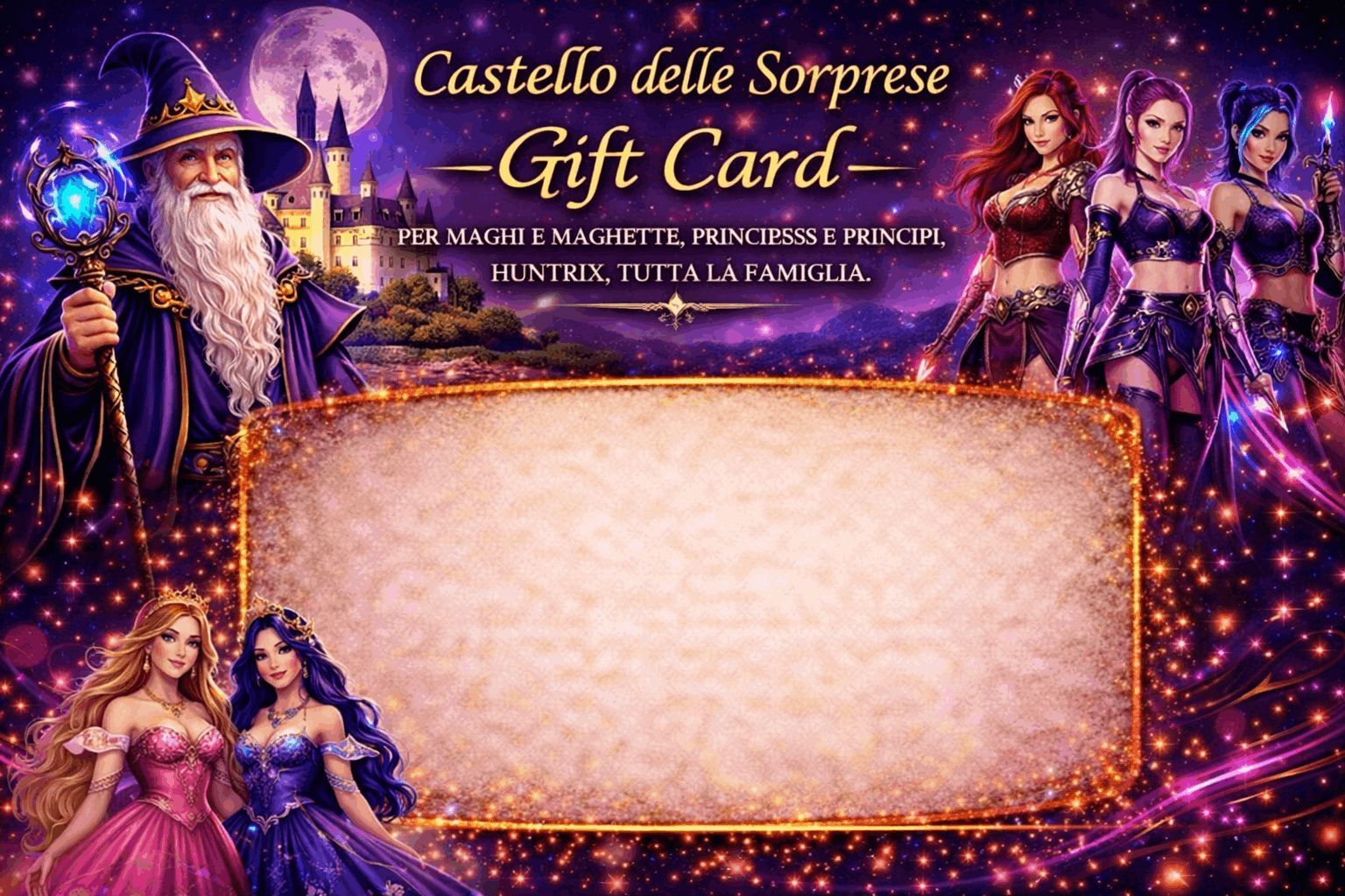 Acquista la card, riceverai al tuo indirizzo email il codice e tutte le info e potrai scaricare anche la card in pdf personalizzata con i soggetti che preferisci: sarà ancora più magico!