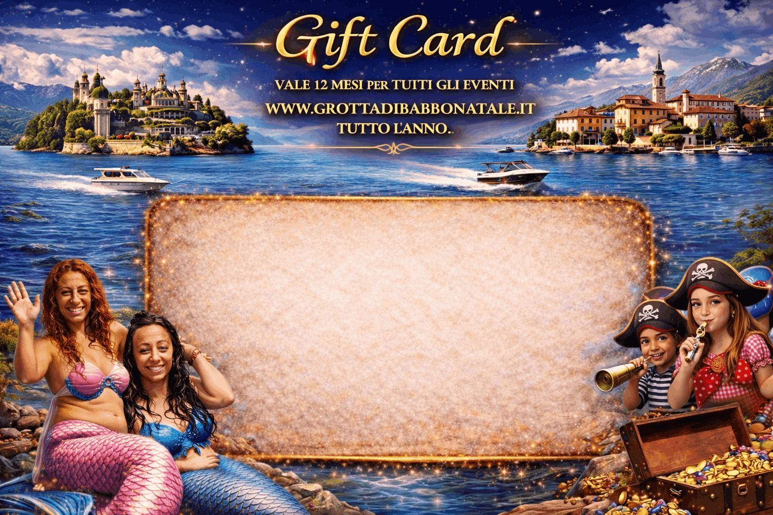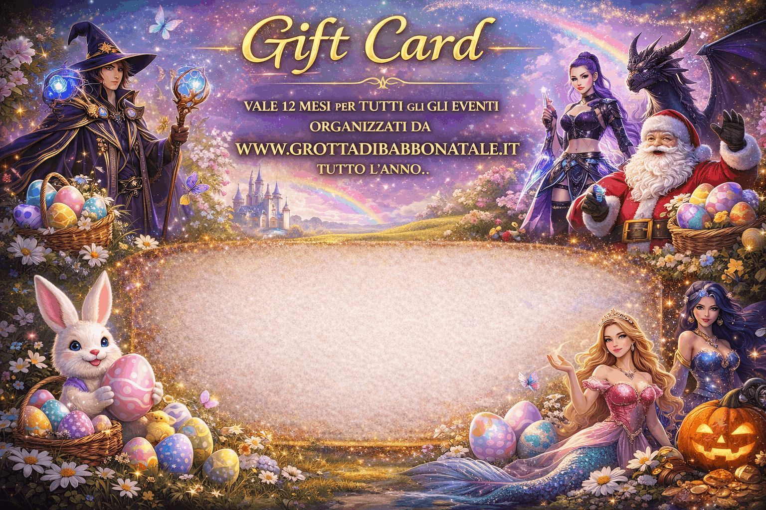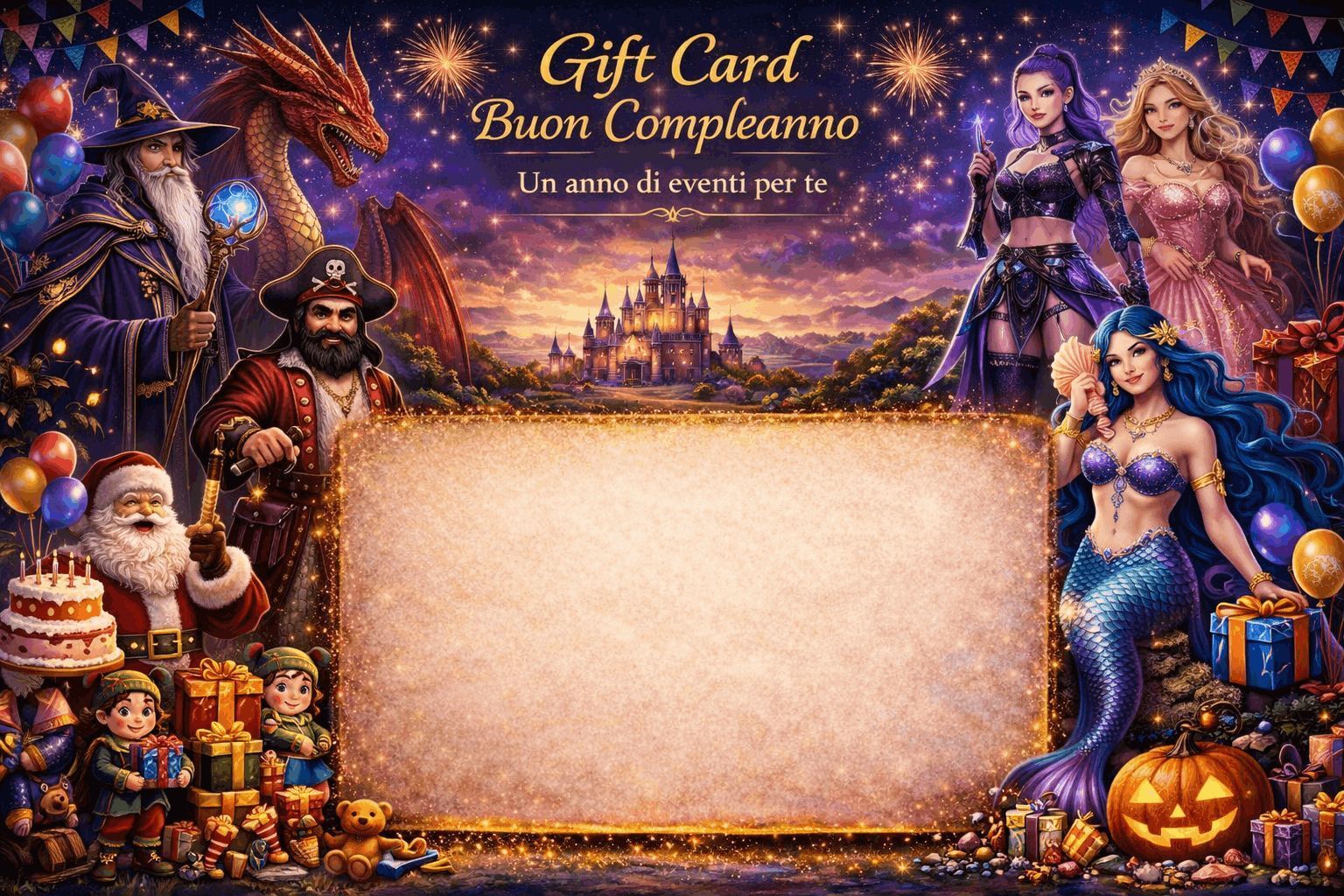 Puoi regalare e personalizzare la Card con un messaggio per il destinatario del dono e diversi soggetti (Pasqua, Natale, Compleanni, Sirene, Maghi e Principesse del Castello delle Sorprese...) Scarica subito la card personalizzata da inviare per email o consegnare personalmente: con il codice e tutte le informazioni utili per utilizzarla, per qualsiasi nostro evento, scegliendo la data che desidera e al momento del pagamento utilizzerà il codice della card. E' semplice e la nostra segreteria è attiva tutto l'anno da lunedì a venerdì sia telefonicamente che per email.